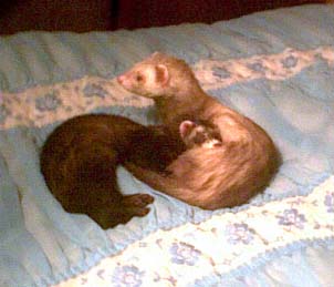 Kathy ist eine von 5 Iltisfähen die bei uns am 1.12.02 abgegeben worden sind, weil der "Züchter" keine Interessenten fand. Sie sind im August in Dresden geboren worden, als "Ausversehenwurf" ! Alle hatten Parasiten und waren schlecht ernährt, aber das werden sie alle sehr schnell nachholen. Kathi ist die dunkelste und kleinste im Wurf, aber auch die aktivste!